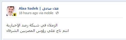وكتب صادق في حسابه على موقع التواصل الاجتماعي "فيسبوك" أمس الاثنين: "الزملاء في شبكة رصد الإخبارية: أنتم تاج على رؤوس المصريين الشرفاء".
