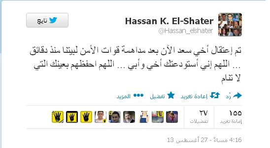 وقال حسن نجل الشاطر في تدزوينة له على موقعه على تويتر منذ قليل " تم إعتقال أخي سعد الآن بعد مداهمة قوات الأمن لبيتنا منذ دقائق اللهم إني أستودعتك أخي وأبي اللهم احفظهم بعينك التي لا تنام"