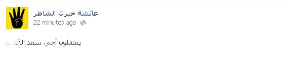 وكانت عائشة خيرت الشاطر كتبت على صفحتها على موقع التواصل الاجتماعي " فيس بوك" فجر الاربعاء : "يعتقلون أخى سعد الان".