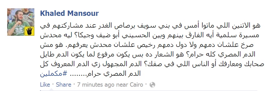 ندد الأستاذ خالد منصور نائب رئيس حزب الإصلاح بمقتل اثنين من المتظاهرين في بني سويف يوم أمس، متسائلا: ما الفرق بين شهيدي بني سويف برصاص الغدر عند مشاركتهم في مسيرة سلمية وبين الحسيني أبو ضيف وجيكا؟