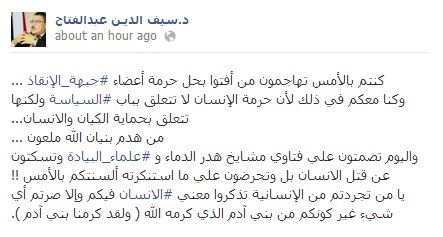 وقال عبدالفتاح عبر حسابه الشخصى على "فيسبوك" اليوم الأربعاء: " كنتم بالأمس تهاجمون من أفتوا بحل حرمة أعضاء جبهة الإنقاذ، وكنا معكم في ذلك لأن حرمة الإنسان لا تتعلق بباب السياسة ولكنها تتعلق بحماية الكيان والانسان.. من هدم بنيان الله ملعون .. واليوم تصمتون علي فتاوي مشايخ هدر الدماء وعلماء البيادة وتسكتون عن قتل الإنسان بل وتحرضون علي ما استنكرته ألسنتكم بالأمس".