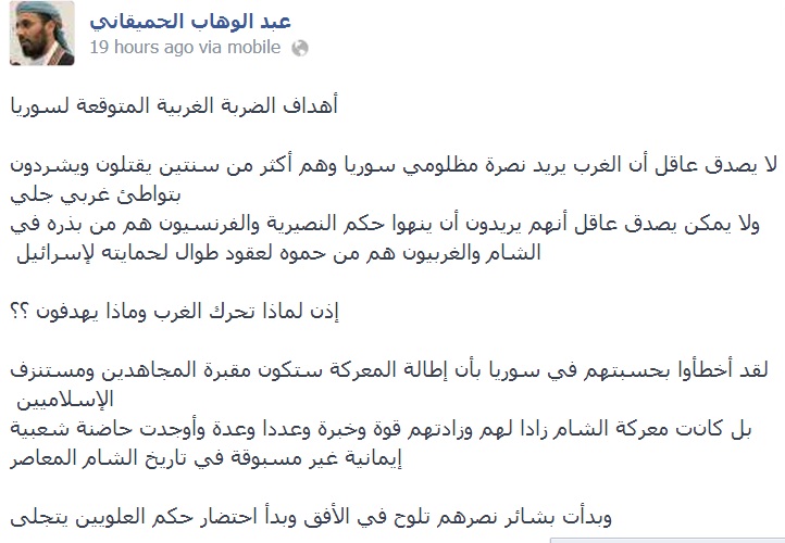 وعدد الحميقاني أهداف الضربة الغربية المتوقعة لسوريا قائلا: لا يصدق عاقل أن الغرب يريد نصرة مظلومي سوريا وهم أكثر من سنتين يقتلون ويشردون بتواطئ غربي جلي، ولا يمكن يصدق عاقل أنهم يريدون أن ينهوا حكم النصيرية والفرنسيون هم من بذره في الشام والغربيون هم من حموه لعقود طوال لحمايته لإسرائيل.