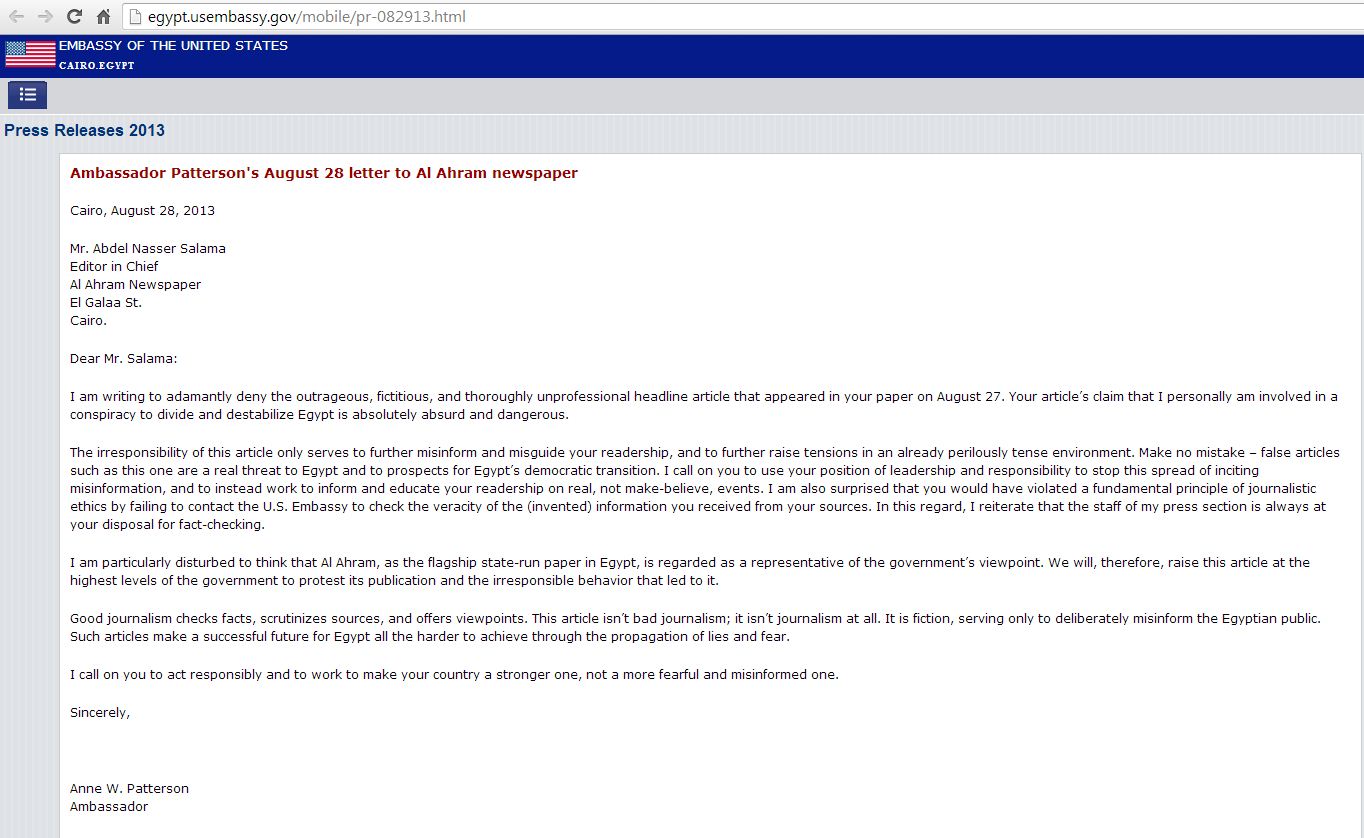 وقالت باترسون ـ في خطابها الذي نشرته السفارة الأمريكية بالقاهرة على موقعها الالكتروني ـ "استنكر بشدة ماورد في مقالك ـ في إشارة لمقال لعبد المحسن سلامة الذي نشر بالأهرام يوم 27 أغسطس الجاري ـ كون المادة الصحفية التي تضمنها المقال بها لغط شديد وأوهام غير مهنية تماما ، حيث أنه أظهرني على أنني متورطة شخصيا في مؤامرة لتقسيم وزعزعة الاستقرار في مصر وهو مناف للعقل تمام كما أنه خطير للغاية.