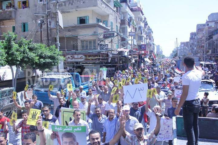 وخرجت المظاهرات الرافضة للانقلاب من أمام مسجد سيدى بشر، ورفع المتظاهرون علامات النصر رابعة.