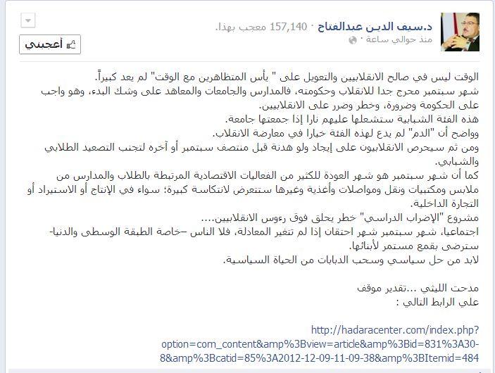 أكد د.سيف الدين عبد الفتاح أن الوقت ليس في صالح الانقلابيين فطلاب المدارس والجامعات أصبحوا غاضبون على الوضع بعد الضغوط المتزايدة عليهم وقد ينضموا مع دخول المدارس والجامعات لمعسكر أعداء الانقلاب بسبب انهار الدماء التي تسيل من الشباب الجامعي الرافض للسلطة ولذالك فالانقلابيين يبحثون عن هدنة.