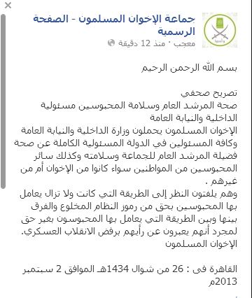 أصدرت جماعة الإخوان المسلمين منذ قليل بيانا بخصوص صحة مرشدها العام وسلامة المعتقلين ، وحملت فيه المسئولية للداخلية والنيابة العامة وكافة المسئولين في الدولة المسئولية الكاملة عن صحة المرشد العام للجماعة وكذلك سائر المعتقلين سواء كانوا من الإخوان أم من غيرهم حسبما ورد في البيان