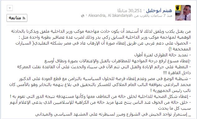 من جانبه قال هيثم أبو خليل -الناشط الحقوقي ورئيس مركز ضحايا لحقوق الإنسان- أن من يقتل يكذب ويلفق لذلك لا أستبعد أن يكون حادث مهاجمة موكب وزير الداخلية ملفق ويذكرنا بالحادثة الوهمية لمهاجمة موكب وزير الداخلية السابق زكي بدر .