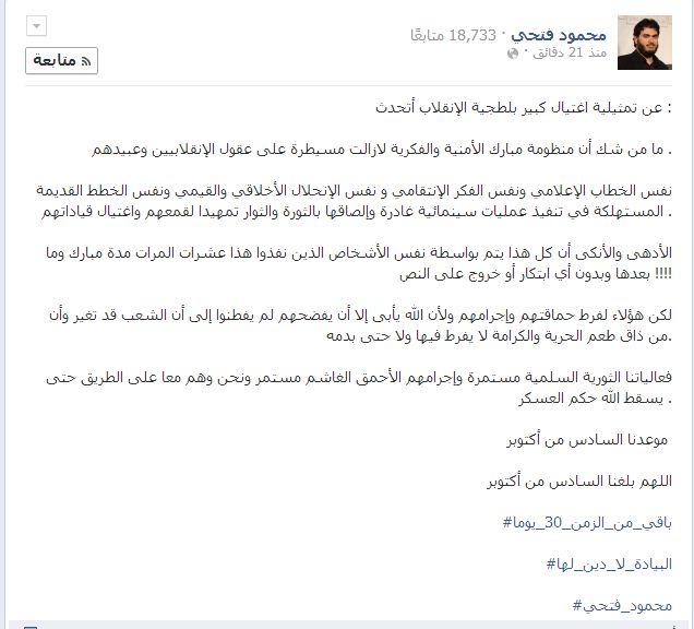وأضاف فتحي أن الخطاب الإعلامي يعبر عن نفس الفكر الإنتقامي و نفس الإنحلال الأخلاقي والقيمي ونفس الخطط القديمة المستهلكة في تنفيذ عمليات سينمائية غادرة وإلصاقها بالثورة والثوار تمهيدا لقمعهم واغتيال قياداتهم .