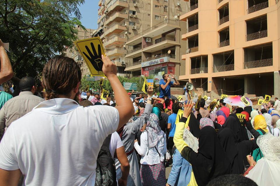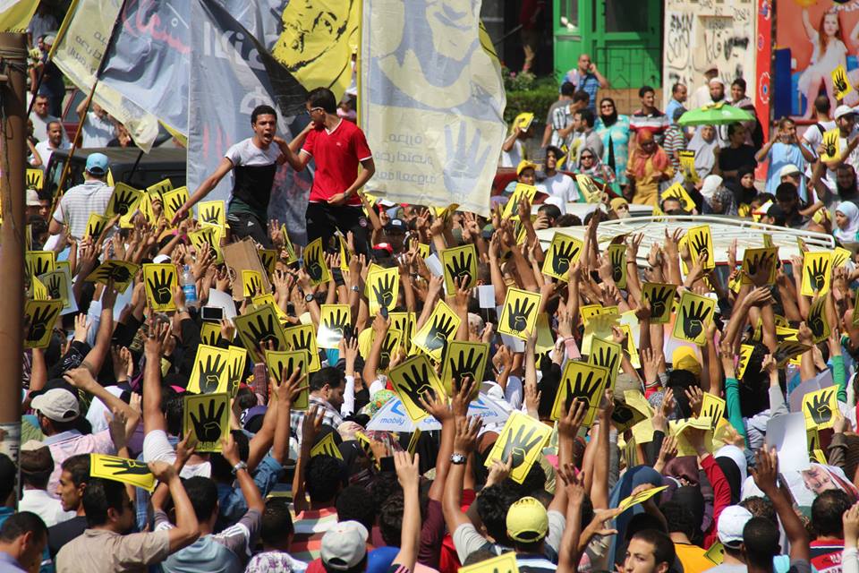 ورفع المتظاهرون شعار النصر "رابعة العدوية "بجمعة "الشعب يحمي ثورته" ومرددين هتافات رافضة للانقلاب العسكري ومنددة بأعمال القمع والاعتقال الدهم وانتهاك الحقوق والحريات.