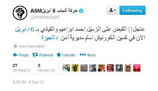 أعلنت حركة 6 أبريل عبر صفحتها على تويتر أنه تم القبض على أﺣﻤﺪ إﺑﺮﺍﻫﻴﻢ، القيادي ب6 أبريل،  ﻓﻲ...