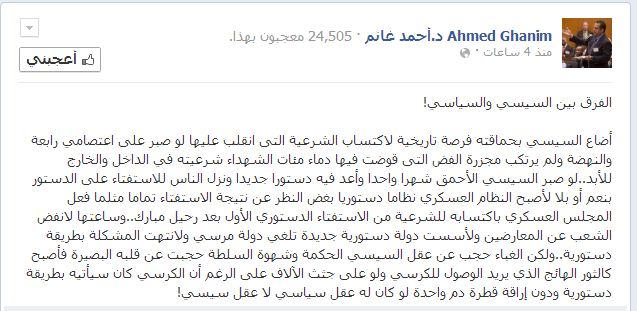 وتابع:- "لو صبر السيسي شهرا واحدا وأعد فيه دستورا جديدا ونزل الناس للاستفتاء على الدستور بنعم أو بلا لأصبح النظام العسكري نظاما دستوريا بغض النظر عن نتيجة الاستفتاء تماما مثلما فعل المجلس العسكري باكتسابه للشرعية من الاستفتاء الدستوري الأول بعد رحيل مبارك..وساعتها لانفض الشعب عن المعارضين ولأسست دولة دستورية جديدة تلغي دولة مرسي ولانتهت المشكلة بطريقة دستورية: