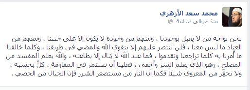 وقال على صفته الرسمية على فيسبوك :"نحن نواجه من لا يقبل بوجودنا ، ومنهم من وجوده لا يكون إلا على جثثنا ، ومعهم من العتاد ما ليس معنا ، فلن ننتصر عليهم إلا بتقوي الله والمضي فى طريقنا ، وكلما خالفنا ما أُمرنا به كلما تراجعنا وتقدموا ، فما عند الله لا يُنال إلا بطاعته ، والله يعلم المفسد من المصلح ، وهو الذى يعلم السر وأخفي ، فعلينا أن نستمر فى المقاومة ، كلُّ بحسبه ، ولا نحقِّر من المعروف شيئاً فكما أن النار من مستصغر الشرر فإن الجبال من الحصي ".
