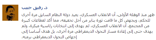 وقال حبيب عبر حسابه الشخصى على "فيسبوك" اليوم السبت: " ظهر منذ الوهلة الأولى، أن الانقلاب العسكري، يعيد دولة النظام السابق مرة أخرى للحكم، ويجهض كل ما قامت ثورة يناير من أجل تحقيقه، مما أكد لقطاعات كبيرة من المجتمع، أن الانقلاب العسكري، لم يهدف إلى انتخابات رئاسية مبكرة، ولم يهدف حتى إلى إعادة مسار التحول الديمقراطي مرة أخرى، بل هدف أساسا إلى إجهاض التحول الديمقراطي برمته".
