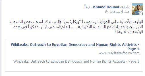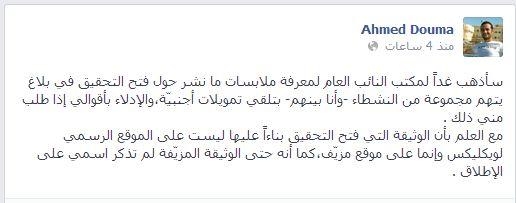 وقال :"سأذهب غداً لمكتب النائب العام لمعرفة ملابسات ما نشر حول فتح التحقيق في بلاغ يتهم مجموعة من النشطاء -وأنا بينهم- بتلقي تمويلات أجنبيّة،والإدلاء بأقوالي إذا طلب مني ذلك مع العلم بأن الوثيقة التي فتح التحقيق بناءاً عليها ليست على الموقع الرسمي لويكليكس وإنما على موقع مزيّف،كما أنه حتى الوثيقة المزيّفة لم تذكر اسمي على الإطلاق ".