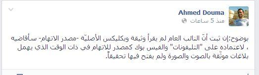 وقال دومة إن ثبت أنّ النائب العام لم يقرأ وثيقة ويكليكس الأصليّة -مصدر الاتهام- سأقاضيه ، لاعتماده على "التليفونات" والفيس بوك كمصدر للاتهام في ذات الوقت الذي يهمل بلاغات موثّقة بالصوت والصورة ولم يفتح فيها تحقيقاً.