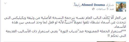 وأضاف دومة تعليقا على خبر التحقيق معه ومع عدد من النشطاء بتهمة التمويل الاجنبي :"من العار ألّا يُكلّف النائب العام نفسه بترجمة النسخة الأصلية من وثيقة ويكيليكس التي تتحدث عن أسماء نشطاء تلقوا تمويلاً أجنبيّاً،لأنّه لو فعل لما وجد اسمي بين هذه الأسماء استمرار الحملة الممنهجة ضد"شباب الثورة" يعني استمرار ذات الأساليب القديمة التي تحكم ".