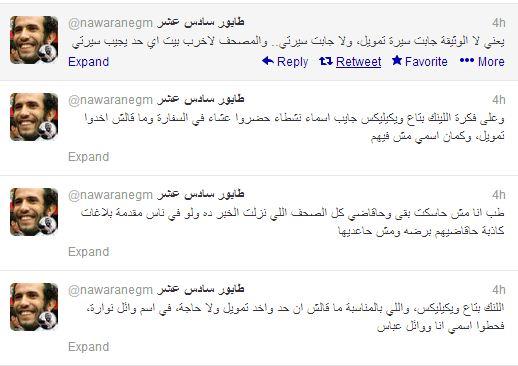 وأضافت على حسابها الرسمي على تويتر:"طب انا مش حاسكت بقى وحاقاضي كل الصحف اللي نزلت الخبر ده ولو في ناس مقدمة بلاغات كاذبة حاقاضيهم برضه ومش حاعديها , اللنك بتاع ويكيليكس، واللي بالمناسبة ما قالش ان حد واخد تمويل ولا حاجة، في اسم وائل نوارة، فحطوا اسمي انا ووائل عباس يعني لا الوثيقة جابت سيرة تمويل، ولا جابت سيرتي.. والمصحف لاخرب بيت اي حد يجيب سيرتي".