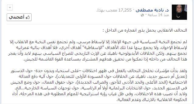 قالت د.نادية مصطفى -الاستاذة بكلية الاقتصاد والعلوم السياسية بجامعة القاهرة ، ومديرة مركز الحضارة للدراسات السياسية- أنه لم تجتمع النخبة السياسية في جبهة الإنقاذ إلا لإسقاط مرسي، ولم تجتمع نفس النخبة مع الانقلاب إلا لإسقاط الإخوان ولا يجمع بينها عدا تلك الأهداف "الإسقاطية" أهداف أخري، فلا أهداف بنائية عمرانية تجمع بينهم".