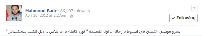 تداول نشطاء على موقع التواصل الاجتماعي فيس بوك ، تعليقا لمحمود بدر مؤسس حركة تمرد ، وهو يسب عمرو موسى ،رئيس لجنة الخمسين لتعديل الدستور حاليا ، في أبريل عام 2012 قائلا "عمرو موسي اتفشخ في اسيوط يا رجالة .. اول القصيدة " ثورة كاملة يا اما بلاش .. ديل الكلب ميحكمناش" وكان هذا الكلام في 30 أبريل عام 2012.
