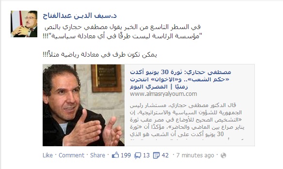 جاء ذلك في تصريحات له بإحدى الصحف المستقلة يوم الأحد الماضي ، الأمر الذي أثار استنكار عدد من الشخصيات السياسية البارزة ومنهم الدكتور سيف الله عبد الفتاح الذي علق على التصريحات قائلا "يمكن تكون طرف في معادلة رياضية مثلا!!!.