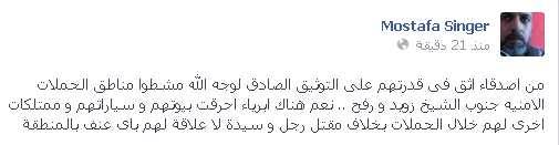 "من أصدقاء أثق فى قدرتهم على التوثيق الصادق لوجه الله مشطوا مناطق الحملات الامنيه جنوب الشيخ زويد و رفح .. نعم هناك ابرياء احرقت بيوتهم و سياراتهم و ممتلكات اخرى ل"هم خلال الحملات بخلاف مقتل رجل و سيدة لا علاقة لهم بأى عنف بالمنطقة".