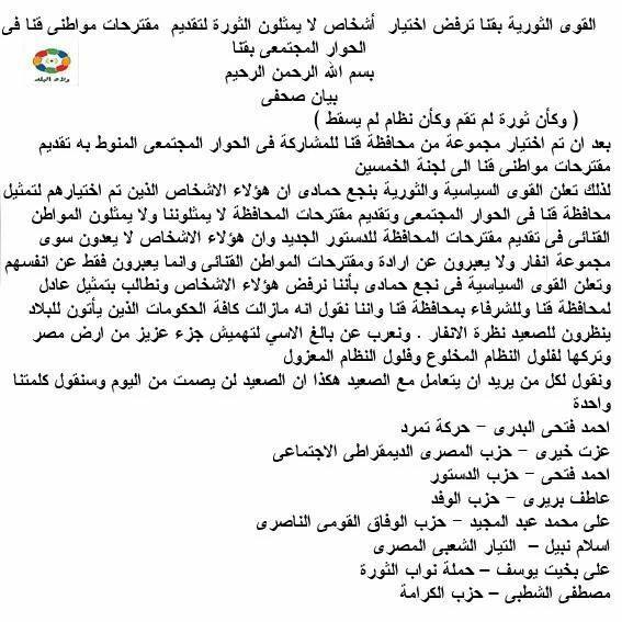 أعلنت القوي الثورية بمحافظة قنا أن الأشخاص الذين وقع الأختيار عليهم  للمشاركة فى الحوار المجتمعى المنوط به تقديم مقترحات مواطنى قنا الى لجنة الخمسين لا يمثلون المواطن القنائي في تقديم مقترحات المحافظة للدستور.