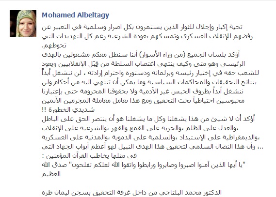 وقال البلتاجي ـ في رسالة على صفحته على موقع التواصل الاجتماعي فيس بوك "أؤكد بلسان الجميع (من وراء الأسوار) أننا سنظل معكم مشغولين بالهدف الرئيسي وهو متى وكيف ينتهي اغتصاب السلطة من قِبَل الإنقلابيين ويعود للشعب حقه في إختيار رئيسه وبرلمانه ودستوره واحترام إرادته".