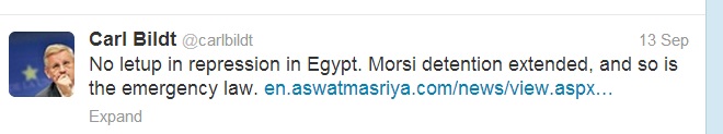 قال وزير خارجية السويد كارل بيلدت إن القمع في مصر لا يتوقف،  معلقا على قرار تمديد قانون الطوارئ لمدة شهرين إضافيين، بالإضافة إلى تمديد حبس الرئيس محمد مرسي.