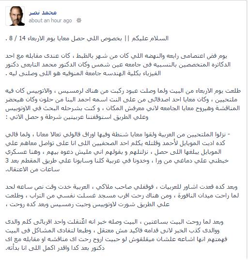 وقال نصر في تدوينة له علي صفحته الشخصية علي موقع "الفيسبوك" أمس (الأحد) أن أثناء ذهابه لأحد أساتذة الفيزياء بكلية الهندسة جامعة عين شميس لعرض فكرة بحثه استوقفت عربيتن شرطة أتوبيس كان يرتاده من محافظة المنوفية إلي القاهرة.