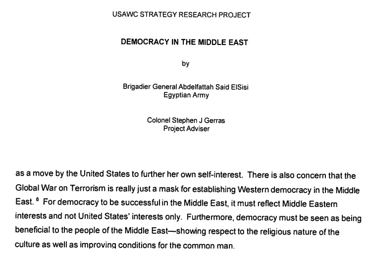 وكتب السيسي في الورقة البحثية التي تحمل عنوان "الديمقراطية في الشرق الأوسط"، وأوردتها مجلة فورين بوليسي: "هنالك مخاوف من أن تكون الحرب العالمية على الإرهاب في الحقيقة مجرد قناع لتأسيس الديمقراطية الغربية في الشرق الأوسط".
