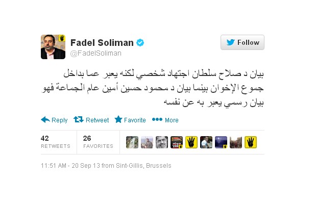 وقال سليمان خلال تغريد له علي موقع "تويتر" :- "بيان د صلاح سلطان اجتهاد شخصي لكنه يعبر عما بداخل جموع الإخوان بينما بيان د محمود حسين أمين عام الجماعة فهو بيان رسمي يعبر به عن نفسه".