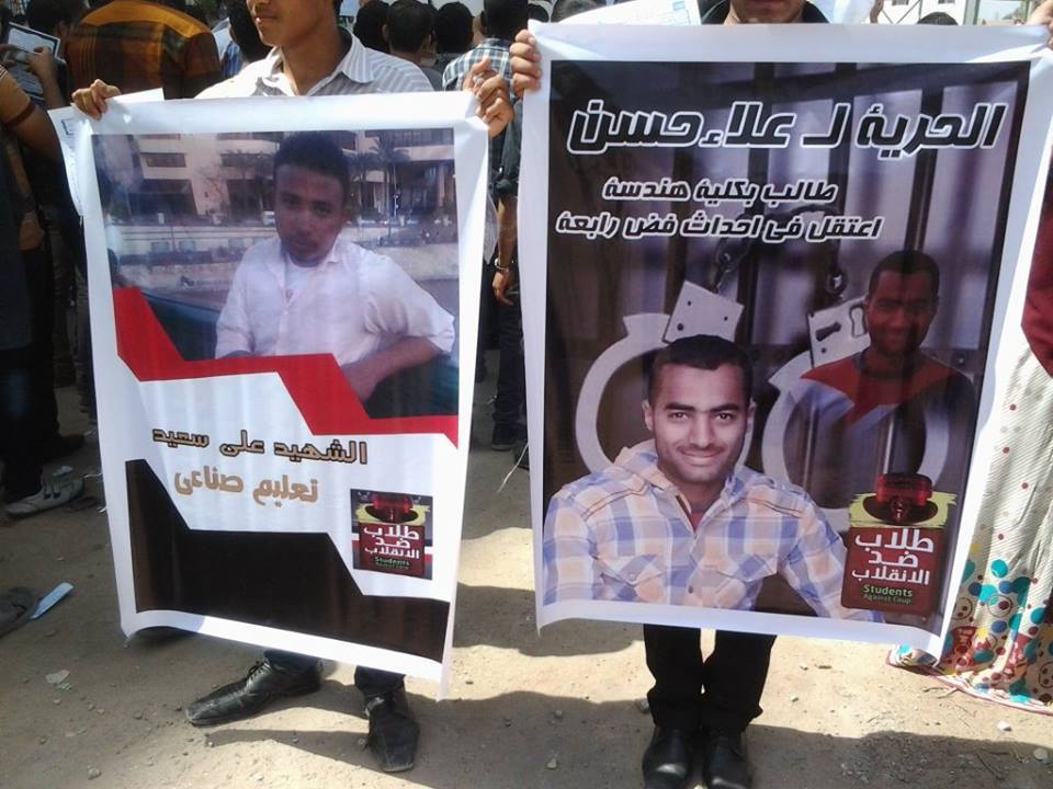 فيما نظم طلاب جامعه بني سويف وقفات احتجاجية داخل الحرم الجامعي رفعوا فيها صور زملائهم من الشهداء والمعتقلين واللافتات التي تطالب بإلغاء الضبطية القضائية.