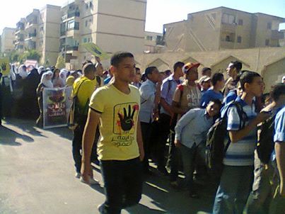 وارتدي الطلاب تيشرتات عليها "إشارات النصر لرابعة العدوية" كما رددا هتافات مناهضة للانقلاب .