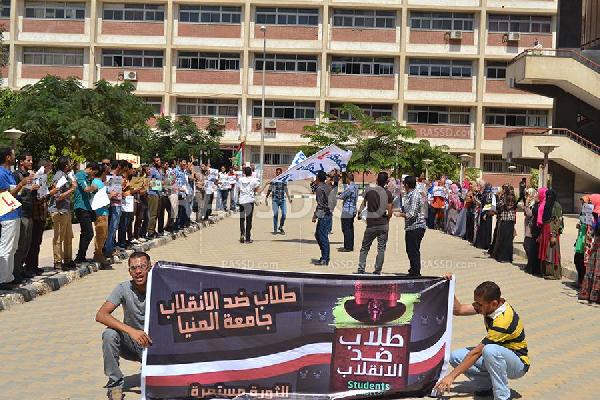 نظم طلاب ضد الانقلاب بجامعة المنيا صباح اليوم الثلاثاء سلسلة بشرية تنقلت بين الكليات المختلفة، رفضا للانقلاب وممارساته.