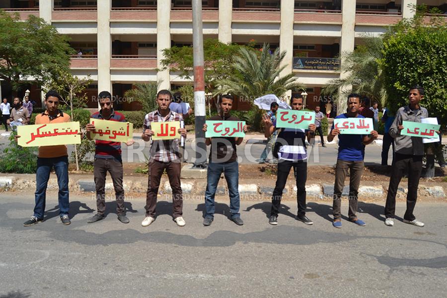 ورفع الطلبة أعلاما تحمل صور زملائهم الشهداء، والمعتقلين من طلاب جامعة المنيا، ولوحات تندد بحكم العسكر وقمع السلطة الحاكمة مثل"فدي بلادي تروح الروح ولا أشوفها بتتعكسر،" اكتب على سور الكلية الداخلية بلطجية".