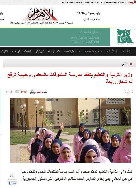 وفي الوقت الذي يهتم فيه وزير التعليم، الدكتور محمود أبو النصر بزيارة المدارس للتأكد بنفسه على إلتزامها بتعليمات الوزارية، من تشغيل الأناشيد المؤيدة للانقلاب مثل تسليم الأيادي، في الطابور المدرسي، ومصادرة أى طالب يعبر عن رأيه ولو بالإشارة بحجة أن الدراسة لا علاقة لها بالسياسية، وتتحدث وسائل الإعلام عن طالبة تثير أزمة خلال زيارة الوزير لمدرسة المتفوقات بالمعادي برفعها علامة رابعة في الطابور..نجد خبر منشور على موقع كايرو دار، موقع من المفترض أنه يهتم بنشر مواد تعليمية للطلبة، تحت عنوان “ملازم أول يثير إعجاب الطالبات بمدرسة بالإسكندرية خلال جولة مدير الأمن”.