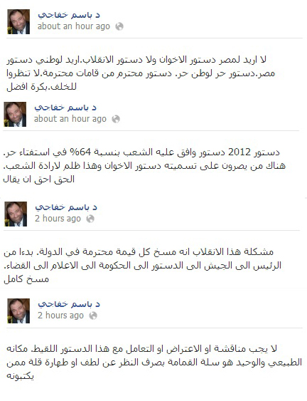 قال الدكتور باسم خفاجي، رئيس حزب التغيير، والمرشح الرئاسي السابق، إنه لا يجب مناقشة أو الاعتراض أو التعامل مع هذا الدستور اللقيط، مضيفاً: " هذه الدستور مكانه الطبيعي والوحيد هو سلة القمامة بصرف النظر عن لطف أو طهارة قلة ممن يكتبونه".