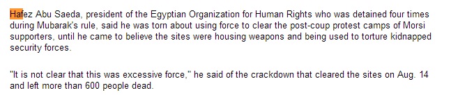 نقلت وكالة أسوشيتد برس عن  حافظ أبو سعدة رئيس المنظمة المصرية لحقوق الإنسان  تبريراته لفض اعتصامي مؤيدي الرئيس بقوله  إن استخدام القوة المفرطة في فض اعتصام مؤيدي الرئيس لم يكن واضحا.