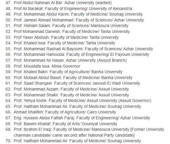 ونشرت الصحيفة نقلًا عن نشطاء مصريين قائمة تضم 70 اسم من أساتذة الجامعات الذين تم إلقاء القبض عليهم من قبل سلطات الانقلاب العسكري مشيرة أن هذه القائمة لا تضمن أسماء الأساتذة الذين قتلوا أو الذين تم فصلهم عن الجامعات بشكل تعسفي.