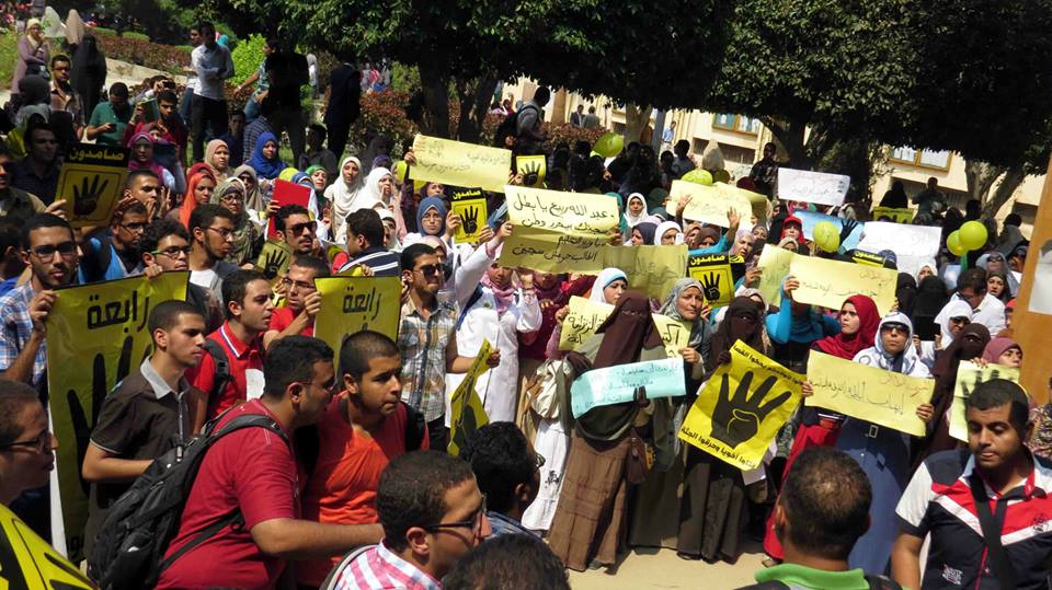 ورفع الطلاب شعار النصر لرابعة العدوية وارتدي بعضهم تيشرتات رابعة كما رفع الطلاب شعارات ترفض الانقلاب وحكم العسكر وعمليات القمع والترهيب والاعتقال.