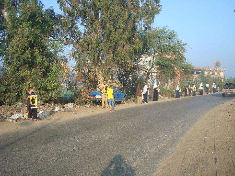 نظم أهالي مدينة منصورية الفرستق التابعة لمدينة كفرالزيات سلسلة بشرية الساعة 7 صباحا رفعوا خلالها اشارة رابعة العدوية.