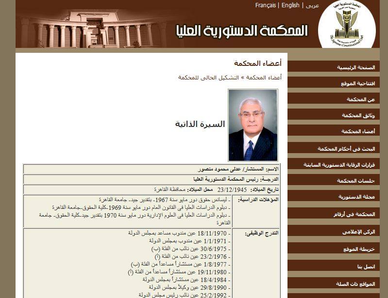 تظهر السيرة الذاتية للرئيس المعين أن الاسم الصحيح له هو "عدلى محمود منصور"، بحسب موقع المحكمة الدستورية العليا.