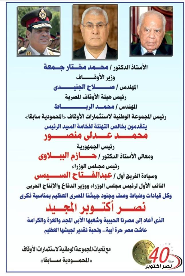 نشرت جريدة الأهرام "إعلانا" في عددها الصادر بتاريخ الأمس حول التهنئة بذكري انتصارات ال 6 من أكتوبر، كُتب فيه اسم الرئيس المعين عدلي منصور "خاطئا"، بينما لم تخطئ نفس الجريدة في اسم الفريق السيسي أو رئيس حكومته "الببلاوي".