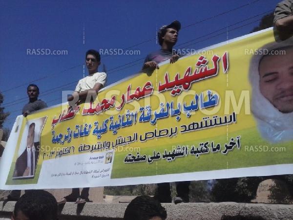 يشيع الآن أهالي قرية سخا التابعة لمركز كفرالشيخ الشهيد عمار محمد خطاب ، الطالب بالفرقة الثانية كلية لغات وترجم، والذى استشهد برصاص الداخلية فى رمسيس أمس.