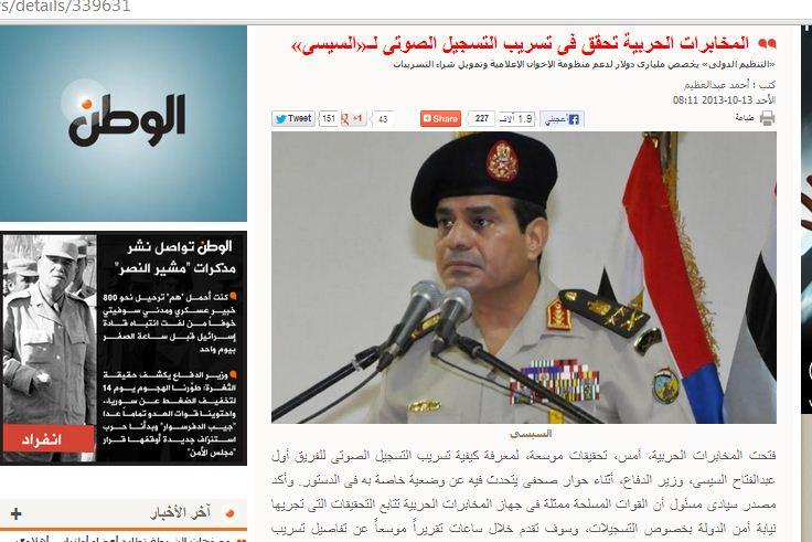 وبحسب صحيفة الوطن المقربة من سلطات الانقلاب أكد مصدر سيادى مسئول أن القوات المسلحة ممثلة فى جهاز المخابرات الحربية تتابع التحقيقات التى تجريها نيابة أمن الدولة بخصوص التسجيلات، وسوف تقدم خلال ساعات تقريراً موسعاً عن تفاصيل تسريب المقاطع الصوتية من حوار «السيسى».بحسب الوطن