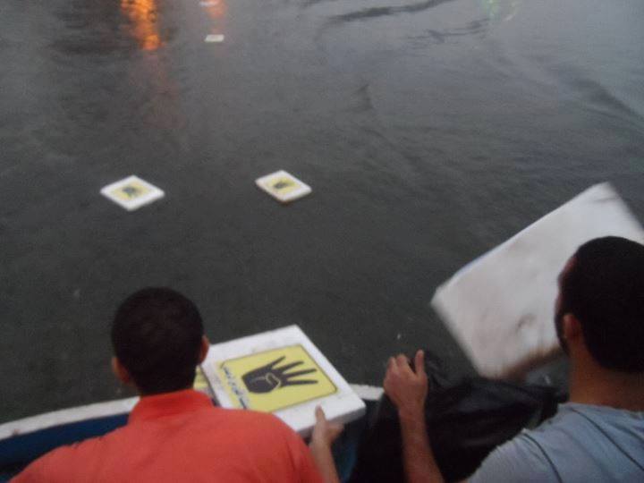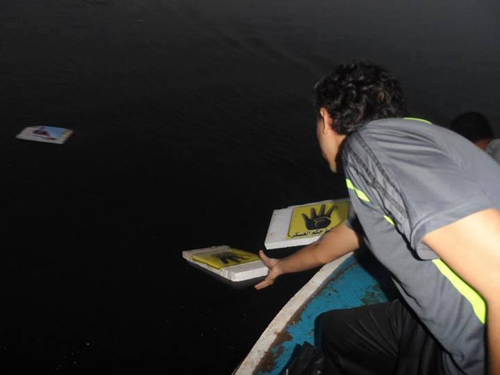 قامت عفاريات ضد الإنقلاب برمى علامات رابعة فى النيل الواصل بين زفتى غربية وميت غمر دقهلية.