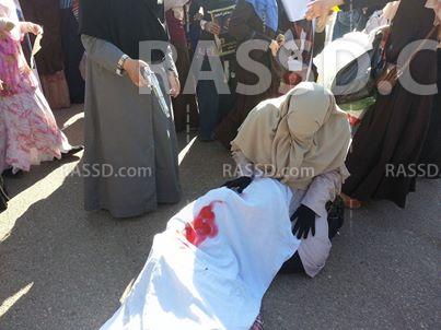 وتقوم الطالبات بعرض مشهد تمثيل لجرائم العسكر من قتل وأسر للمتظاهرين السلميين.
