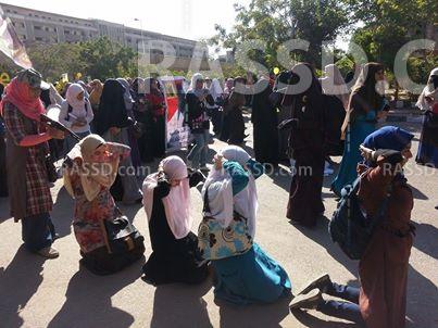 وتردد الطالبات هتافات مثل "حرية..حرية"، "شيل العمة شيل ..يا طيب يا عميل"، رافعين صور للأحداث الأخيرة ولافتى مدون عليها طلاب ضد الانقلاب..لا دراسة تحت حكم العسكر".