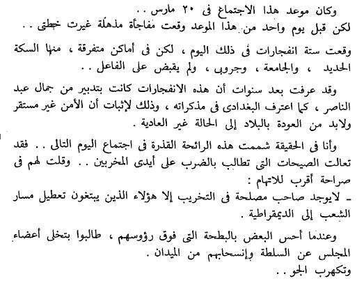 كما استدعي النشطاء علي موقع "الفيسبوك" مقتطفات من مذكرات اللواء محمد نجيب الذي يكشف فيها عن ضلوع جمال عبد الناصر في  انفجارات ستة منها  الجامعة والسكة الحديد وجروبي في أحداث 20 مارس بحسب اعترافات عبد اللطيف البغدادي في مذكراته  كدليل علي إمكانية تورط القوات المسلحة في تنفيذ التفجيرات.