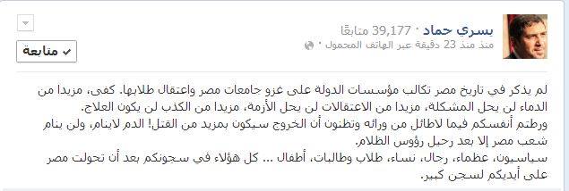 وتابع: "ورطتم أنفسكم فيما لاطائل من ورائه وتظنون أن الخروج سيكون بمزيد من القتل! الدم لاينام، ولن ينام شعب مصر إلا بعد رحيل رؤوس الظلام. سياسيون، عظماء، رجال، نساء، طلاب وطالبات، أطفال … كل هؤلاء في سجونكم بعد أن تحولت مصر على أيديكم لسجن كبير".